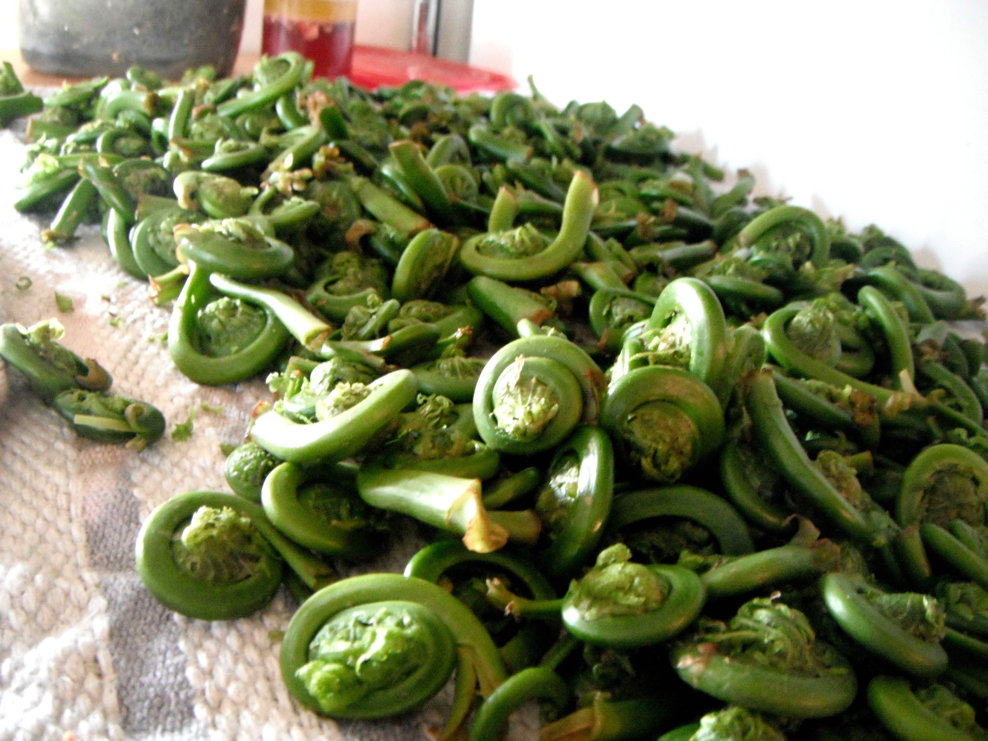 Not a day too soon, my sister and I trudged out through the flooded fields of north Burlington to search for fiddleheads. Luckily we remembered our rain-boots, for we encountered a few miniature lakes on our way into the woods. We began searching along the river’s edge, but we found only a dozen rusting automobiles, a crushed porcelain doll, and a rabbit skull. Deeper into the marsh we began to see the curled heads of our green treasures. If we had waited one more week all of the delicate fiddleheads would have unfurled, and it was more difficult than we thought to find tightly wound, young heads. If you pluck the young heads from the center of the base of the fern, you’ll get a better taste. When out gathering make sure to pick “Ostrich ferns,” which sprout out of a messy brown base and unfurl into a lush green. Most other fern varieties are either inedible or too tough to enjoy.