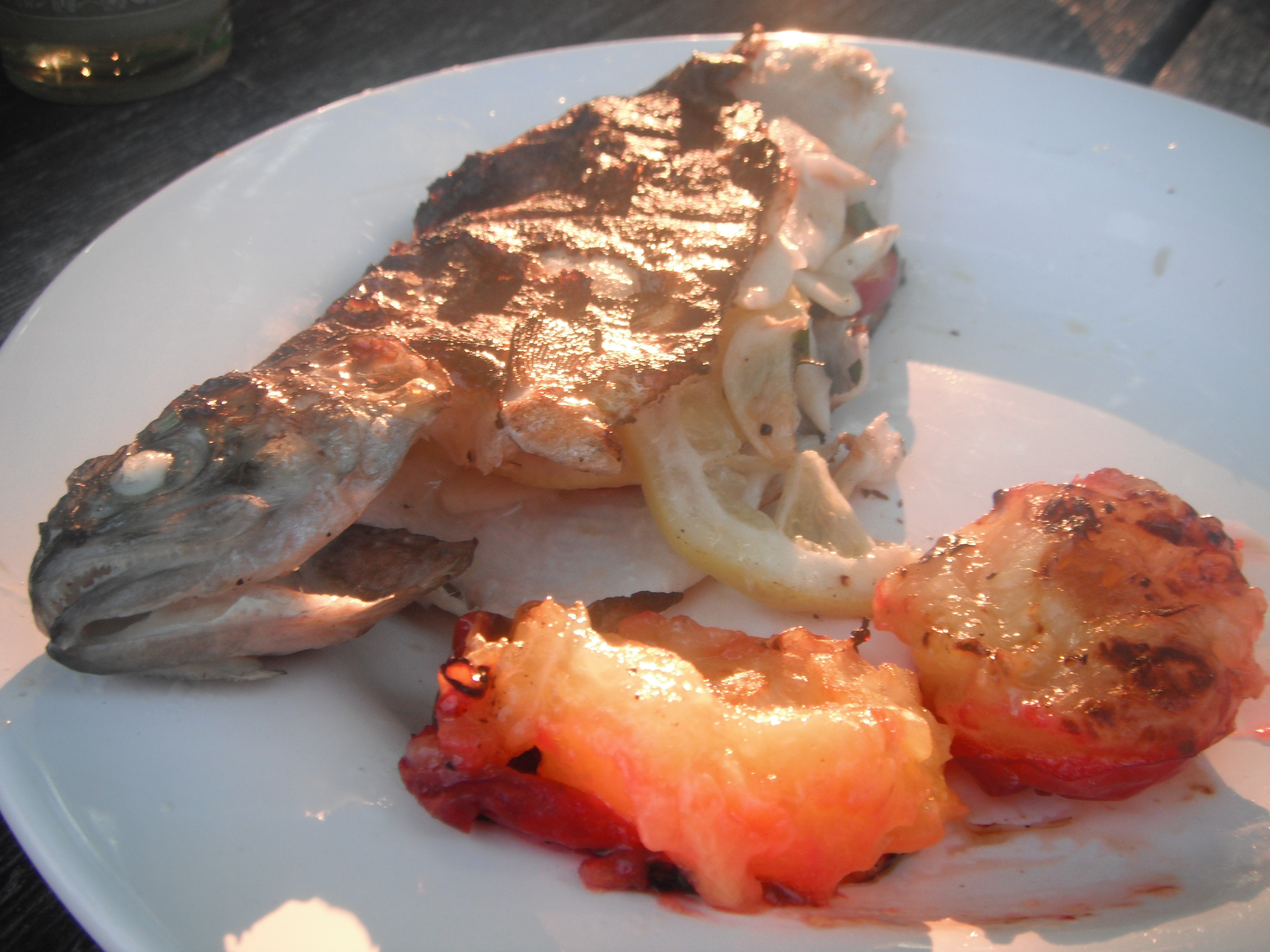 Grilled trout with lemon, olive oil, salt, pepper, plums, and chives.