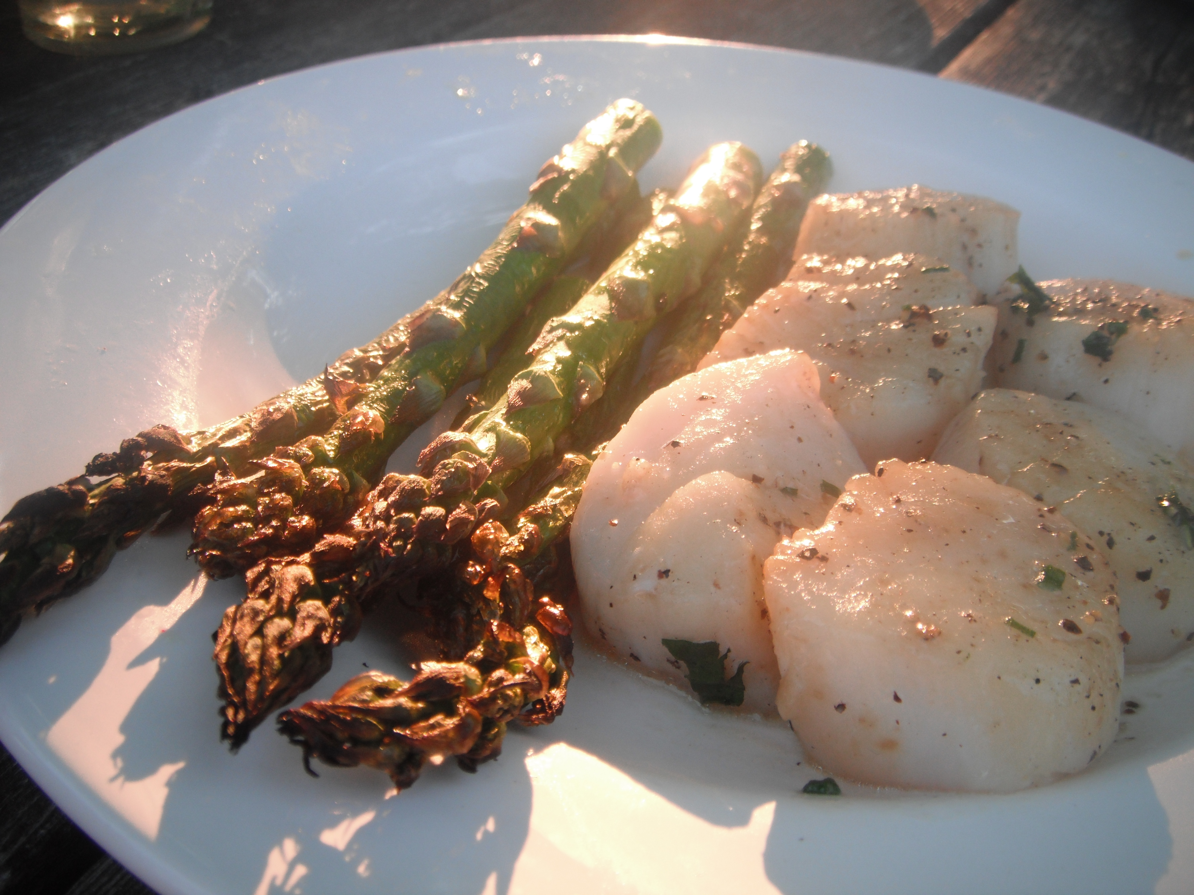 Grilled asparagus and scallops with a butter, honey, and whiskey marinade.