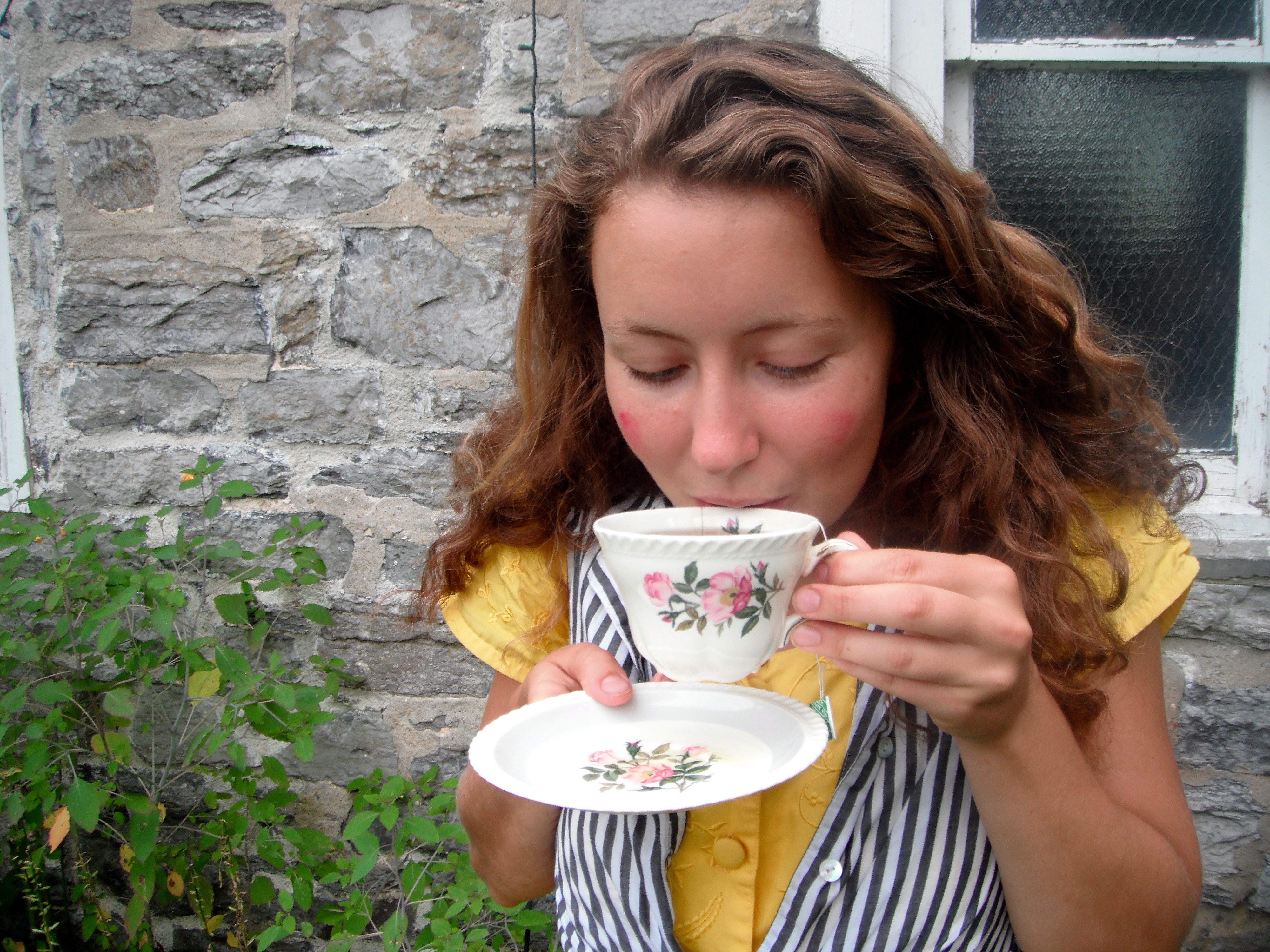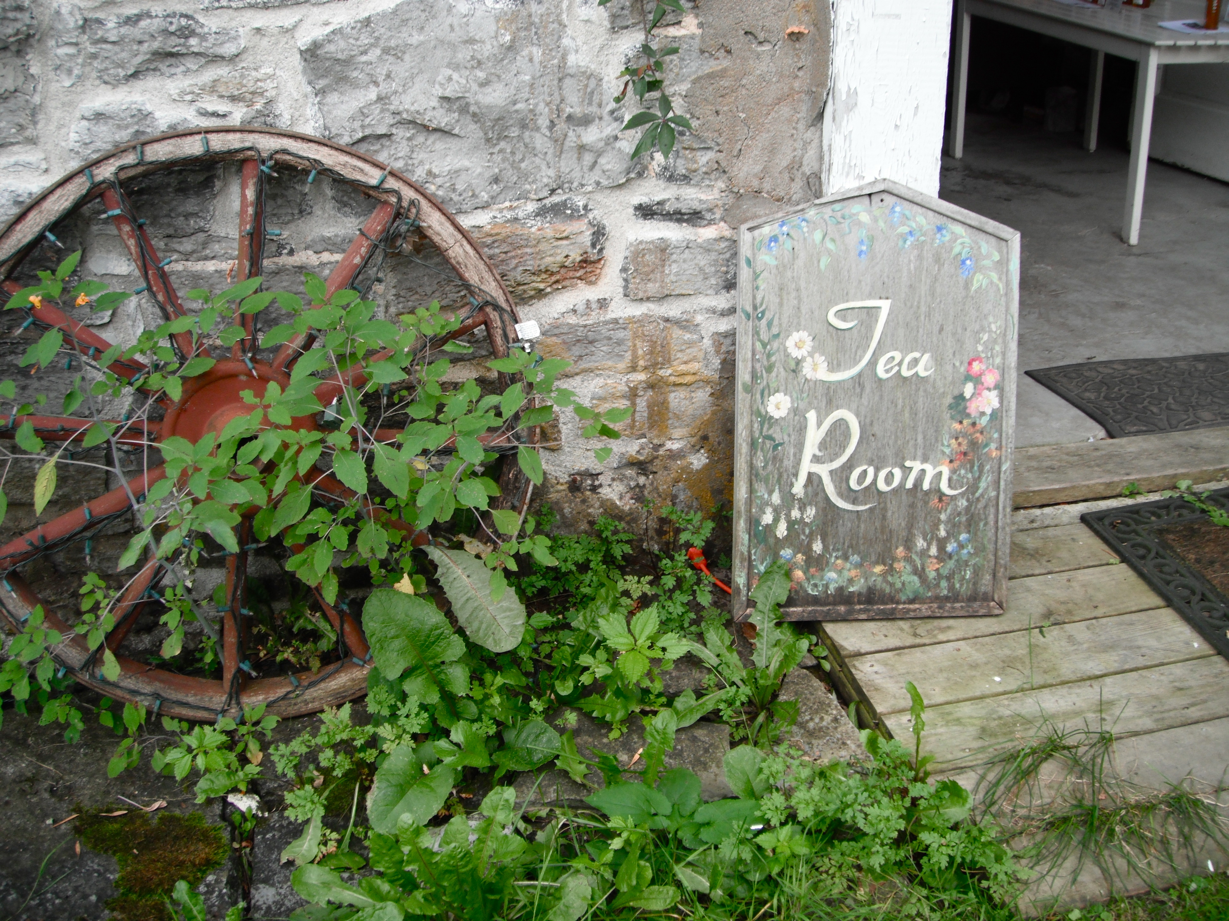 Our next stop was the Fisk Farm, a historical family farm with old stone buildings, an overflowing vegetable garden, and best of all– a tea room, complete with three kinds of afternoon cakes! Carrot cake, cheesecake with fruit, and a flourless chocolate torte. All of the tea was served in ancient porcelain cups and saucers in a little room decorated with dried herbs and flowers. Our group slowly gathered on the lawn, where the inn was hosting a little harp concert. It was amusing to watch the disturbed expressions on the faces of the small audience when a band of rambunctious, colorful bicyclists invaded their serene afternoon entertainment.