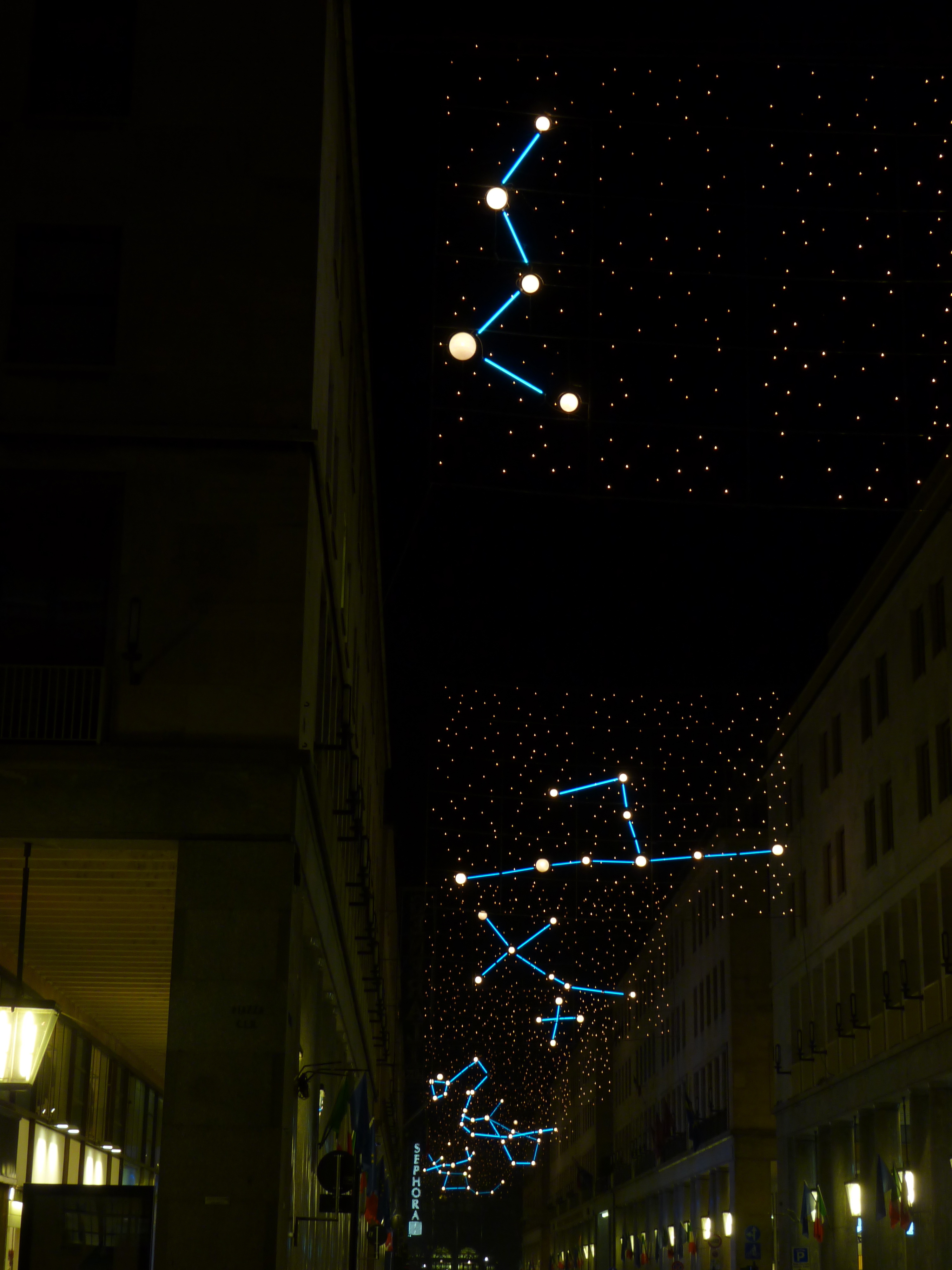 There is one narrow pedestrian street that begins at the water in Genova and curves through the center of town with a story written on the cobblestones in white paint, something about the end of the world, middle-aged monsters and monsters from the middle ages, astrology, and so on. It continued through the red light district where a number of very obvious prostitutes and butchershops.