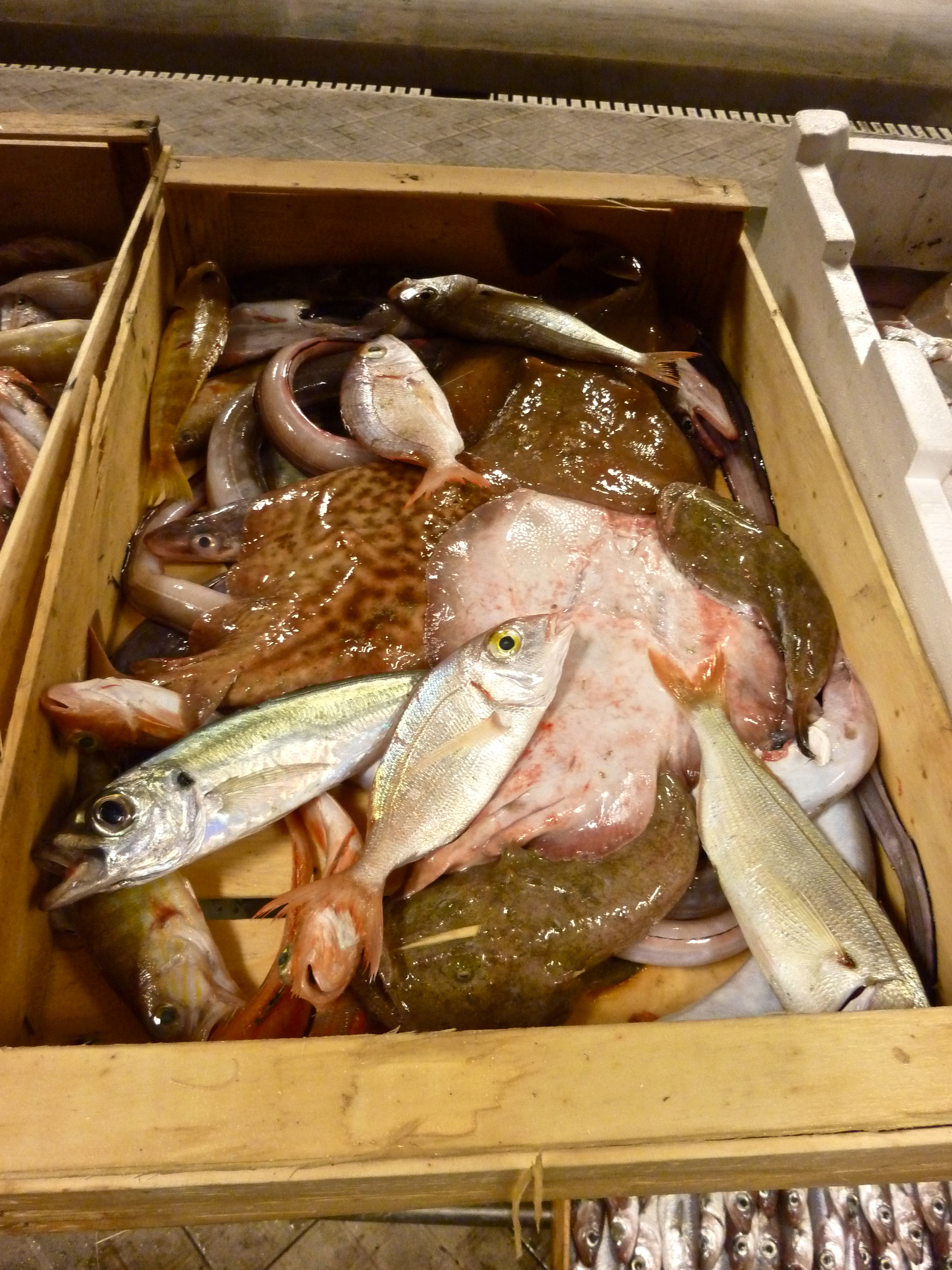 We’re now in Santa Marguerita Ligure, a little seaport town, quite sunny and fishy. We walked upon some fishermen hauling up the day’s catch, some orata, some shrimp, and a bunch of small fish that looked like sardines but which were named something with a ‘p’, I don’t remember. In any case, we bought a bunch of the little ones because they were cheap and the fellow taught us how to rip off their heads with our fingers, pull out the spine, and clean the guts with one swift motion. We brought them home and did just that, then we breaded them in polenta and rosemary, and fried them in butterfly fillets. Wee hee!