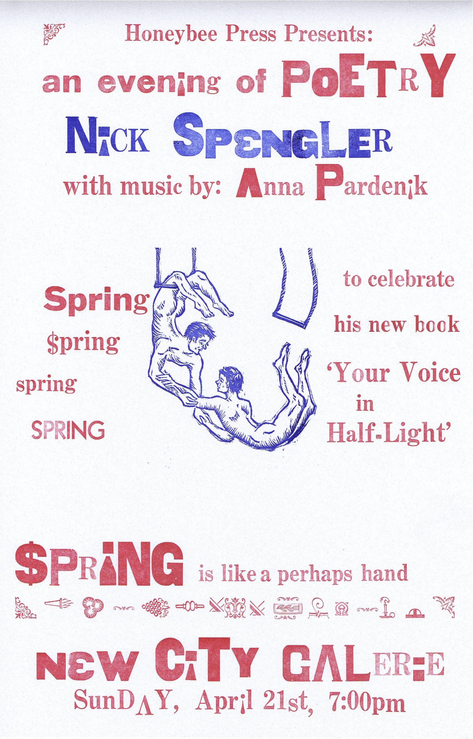 I frequently work with the Honeybee Press, designing blockprints for their book covers and posters. Ben Aleshire does the letterpress wording, but you can see my little print in the center: