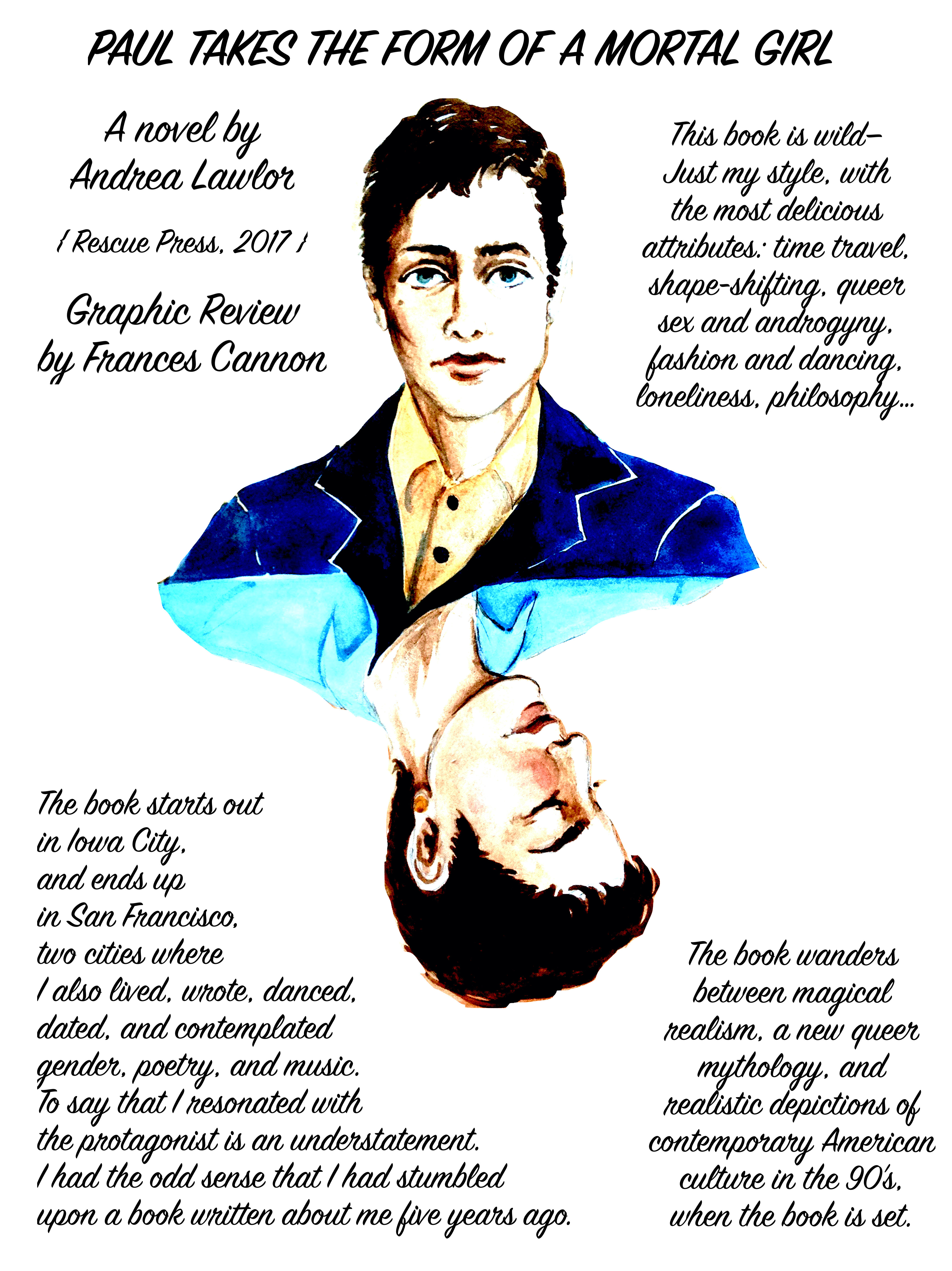 I wrote a graphic book review on Andrea Lawlor’s Paul Takes the Form of a Mortal Girl, one of my favorite books that I have read in the past few years, and it has now been published in Refuze Review (which burned hot and bright and I believe is now defunct, sadly!). However, you can read the full piece below: