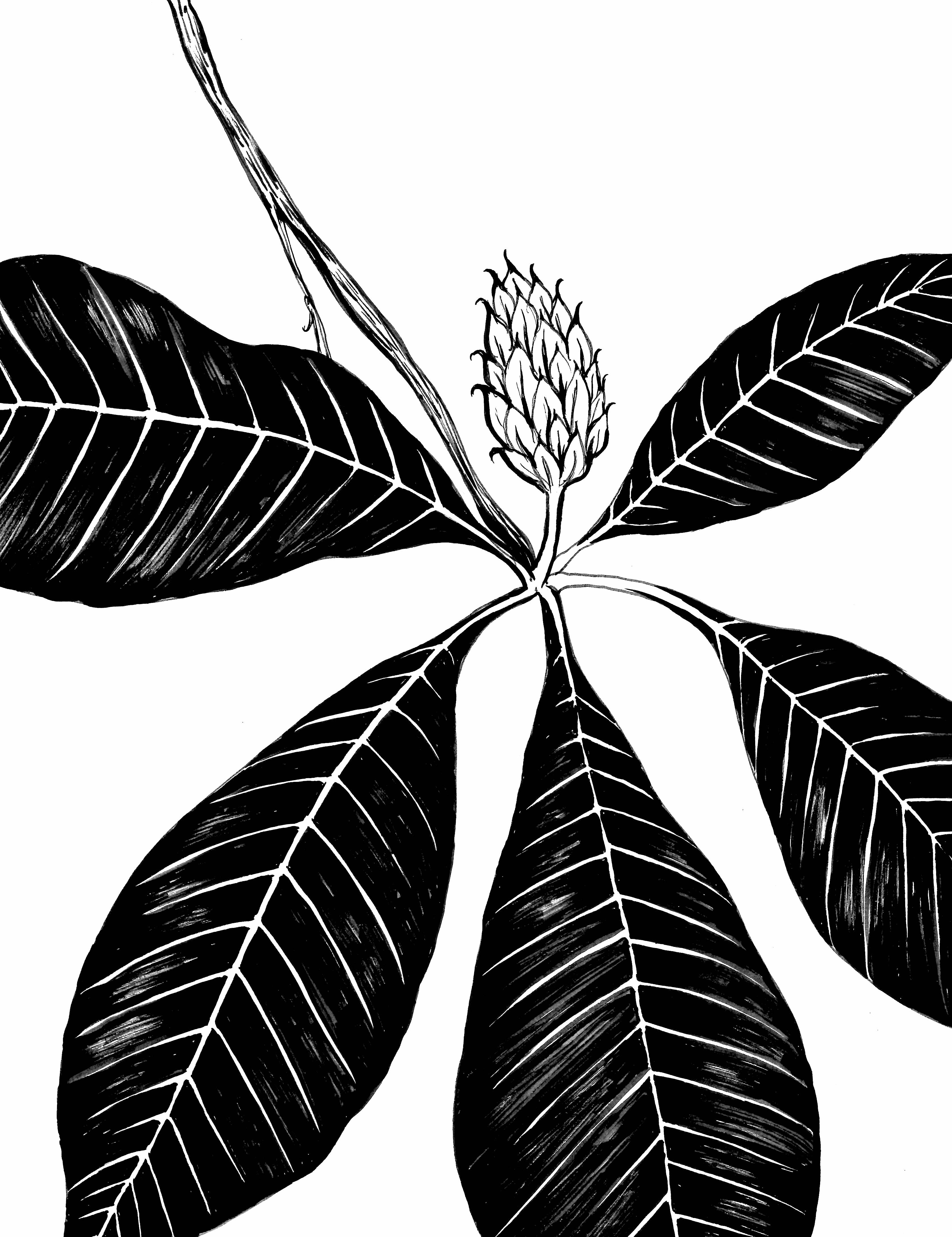 Her leaves are huge—longer than my arm and wider than my head—one leaf that I plucked measured two and a half feet long (30 inches) and a foot wide. Each leaf is obovate, or oblanceolate if you’re going to get nitpicky; broadest distal to the middle of the leaf. The upper surface of the leaves is a vibrant green, and the underside is whitish, soft, and slightly hairy. The midrib is thick and pale green, and the veins emerge pinnately along it. The stipule is quite thick. Forgive me—I’m going to continue with a few more technical descriptors, but you’ll soon learn why I’m going into so much detail. The leaves are simple and entire, yet they are clustered together towards the end of the stem, giving the illusion that they are leaflets in a palmately compound leaf, but don’t be fooled—the axillary buds present at the base of each leaf help you to see that they are not. As a group, their arrangement forms a little dome, resembling an umbrella of leaves, thus the common name umbrella magnolia.