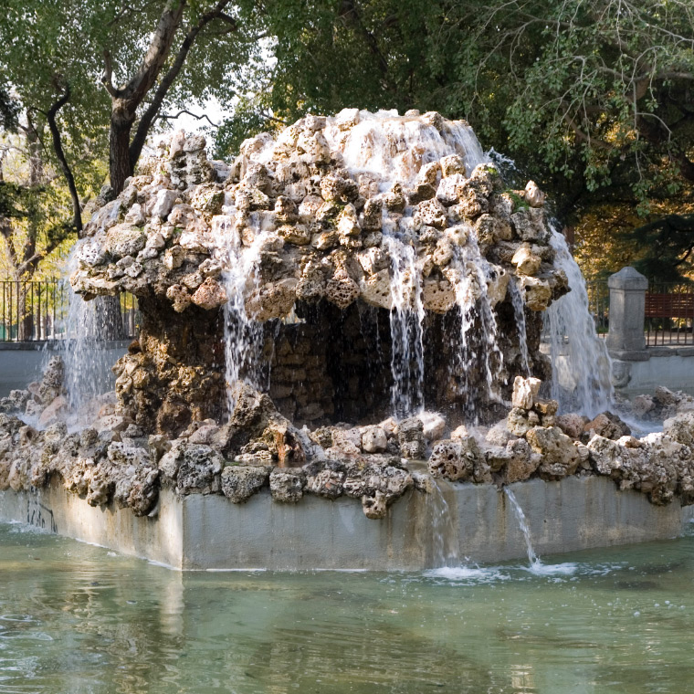 There is a strange vision lodged in my memory and subconscious: fountains and alcoves dripping with artificial mineral deposits, bulbous growths of stone and cement, shells embedded in hypnotic mosaic patterns, wet with water and algae. When I visited Madrid last summer for a botany conference, I wandered from park to park in sickening heat, and in a shaded courtyard in the heart of El Retiro Park, I noticed a fountain that I instinctively clocked as ‘ugly’—ugly to me, yet utterly compelling. I couldn’t pull my eyes away. The fountain looked like a mistake, or an unfinished sculpture—rough, loose globs of stone and cement, forming two massive structures: a crude base, and a loosely elevated ‘top’, water spilling forth haphazardly.