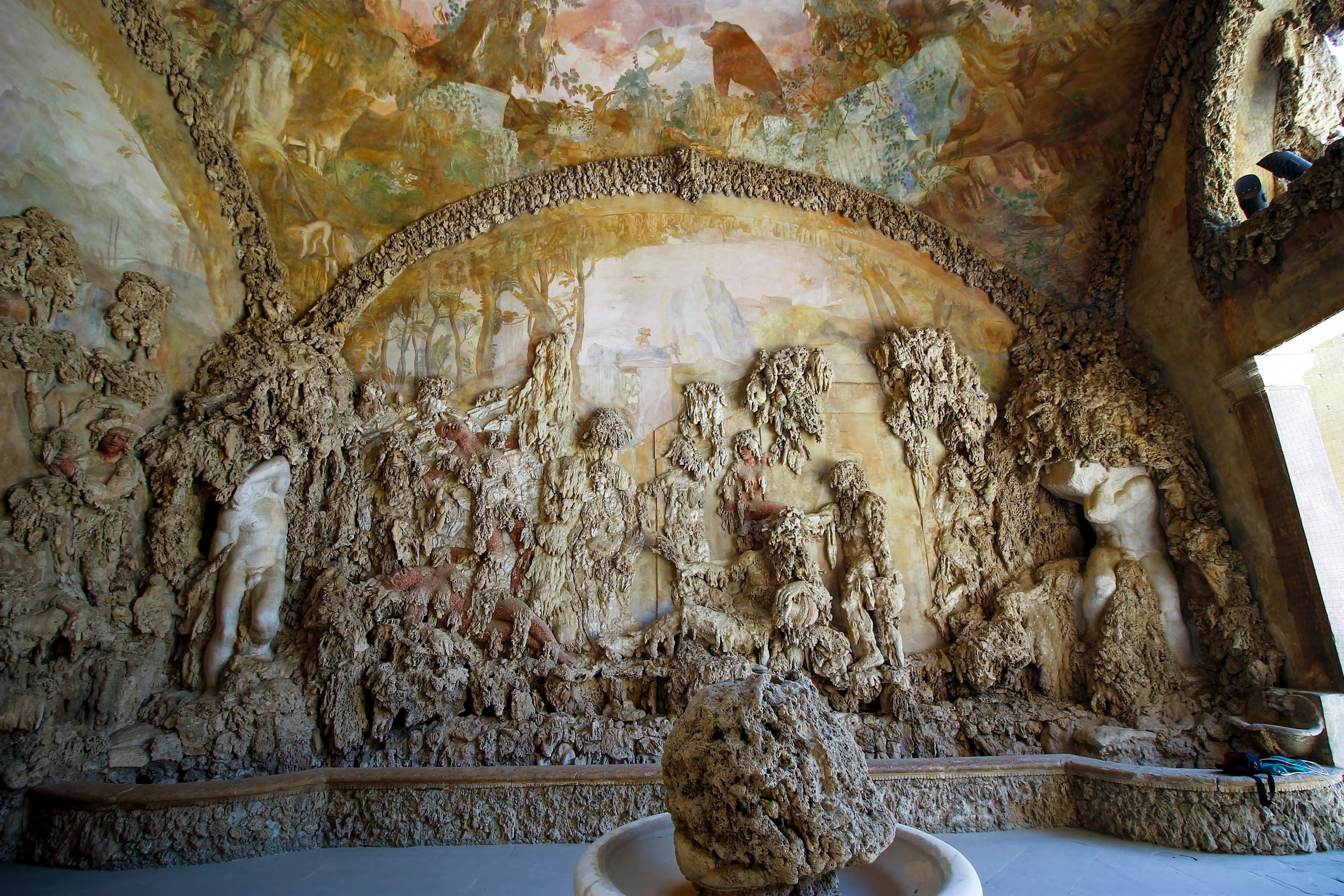 There is a strange vision lodged in my memory and subconscious: fountains and alcoves dripping with artificial mineral deposits, bulbous growths of stone and cement, shells embedded in hypnotic mosaic patterns, wet with water and algae. When I visited Madrid last summer for a botany conference, I wandered from park to park in sickening heat, and in a shaded courtyard in the heart of El Retiro Park, I noticed a fountain that I instinctively clocked as ‘ugly’—ugly to me, yet utterly compelling. I couldn’t pull my eyes away. The fountain looked like a mistake, or an unfinished sculpture—rough, loose globs of stone and cement, forming two massive structures: a crude base, and a loosely elevated ‘top’, water spilling forth haphazardly.